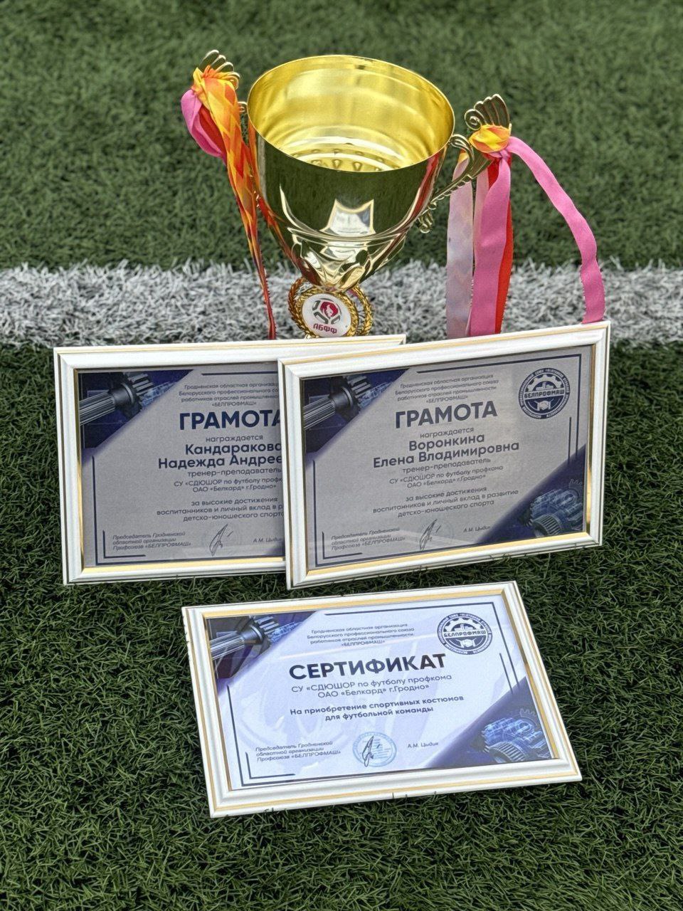 Команда получила сертификат на приобретение новой формы от Белорусского профессионального союза работников отраслей промышленности «БЕЛПРОФМАШ», а также были вручены благодарности тренерам за их труд и достижения.