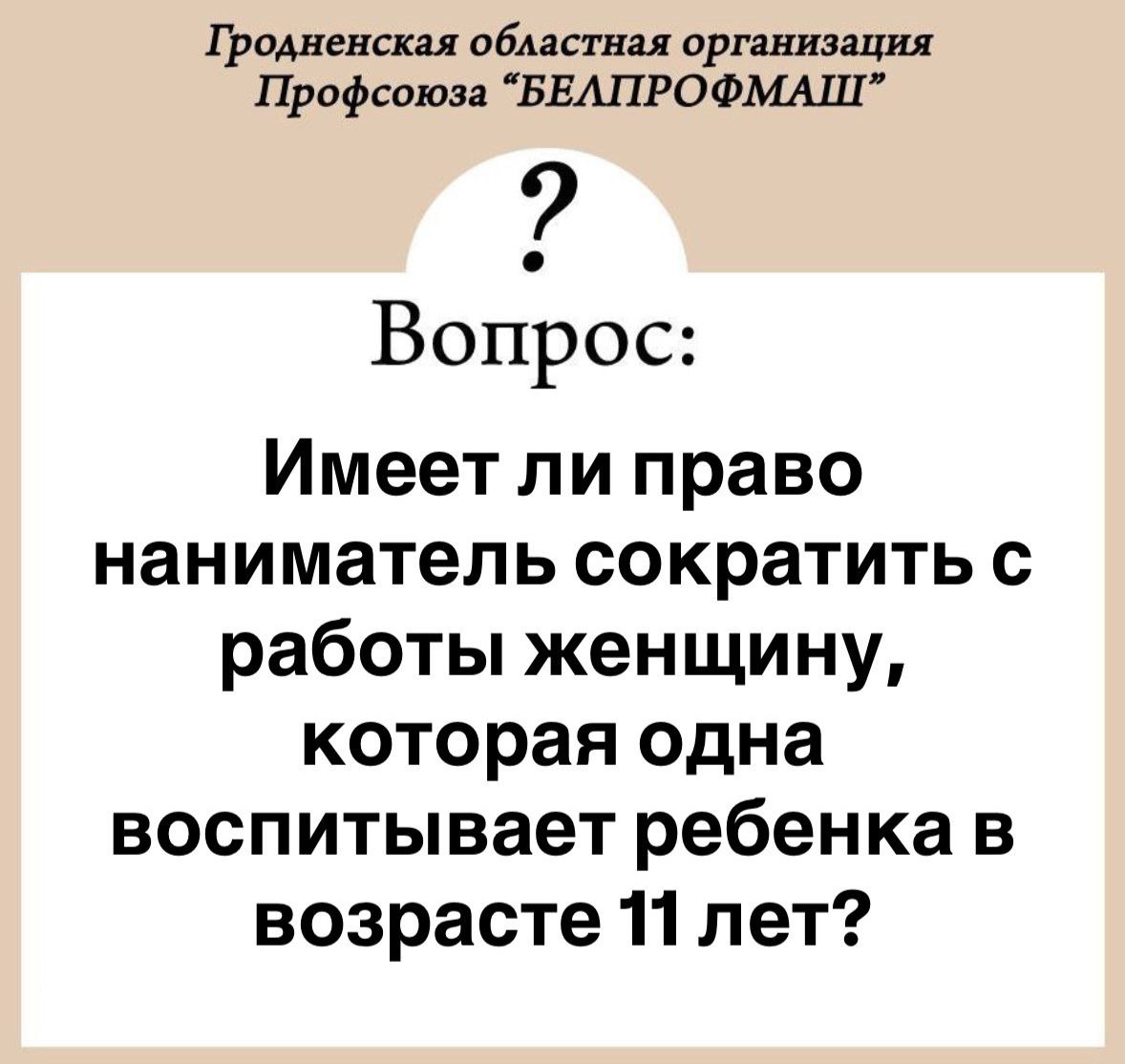Вопрос: Имеет ли право наниматель сократить с работы женщину, которая одна воспитывает ребенка в возрасте 11 лет? Ответ: Нет не имеет право. Запрещается увольнять по сокращению численности и штата беременных женщин, женщин, имеющих детей в возрасте до трех лет, одиноких родителей, имеющих детей в возрасте до четырнадцати лет (детей-инвалидов в возрасте до восемнадцати лет) (ч. […]