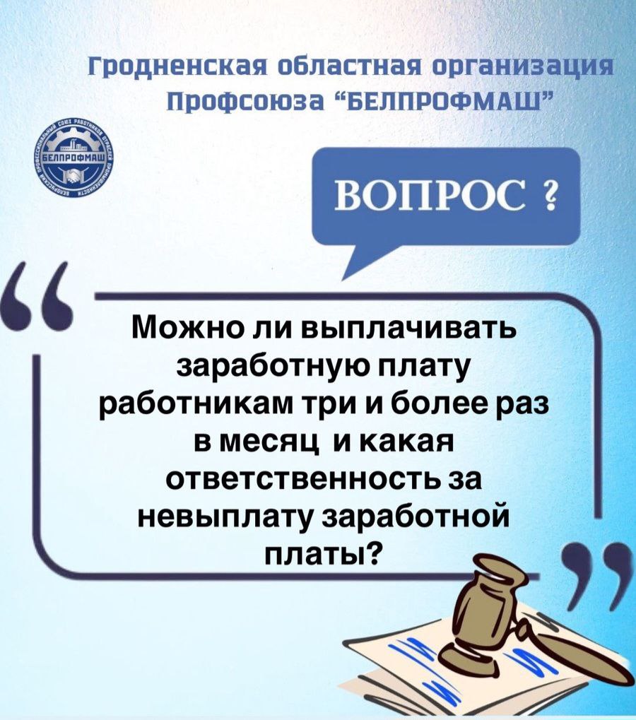 Вопрос: Можно ли выплачивать заработную плату работникам три и более раз в месяц и какая ответственность за невыплату заработной платы? Ответ: Заработную плату необходимо выплачивать минимум дважды в месяц. При этом нужно соблюдать установленные сроки и порядок, указанные в трудовом договоре с работником, коллективном договоре, локально правовом акте организации (п. 4 ч. 1 ст. 55, […]