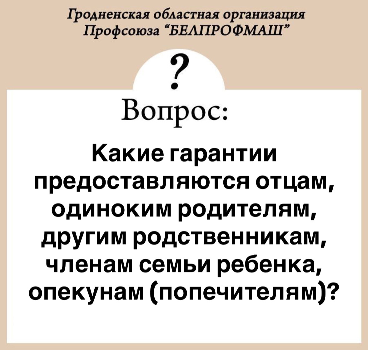 Вопрос: Какие гарантии предоставляются отцам, одиноким родителям, другим родственникам, членам семьи ребенка, опекунам (попечителям) Ответ: Трудовым законодательством Республики Беларусь предусмотрены следующие гарантии: Отпуск по уходу за ребенком до достижения им возраста трех лет предоставляется по усмотрению семьи работающим отцу или другому родственнику, члену семьи, опекуну ребенка, фактически осуществляющим уход за ребенком (ч. 1 ст. 271ТК […]
