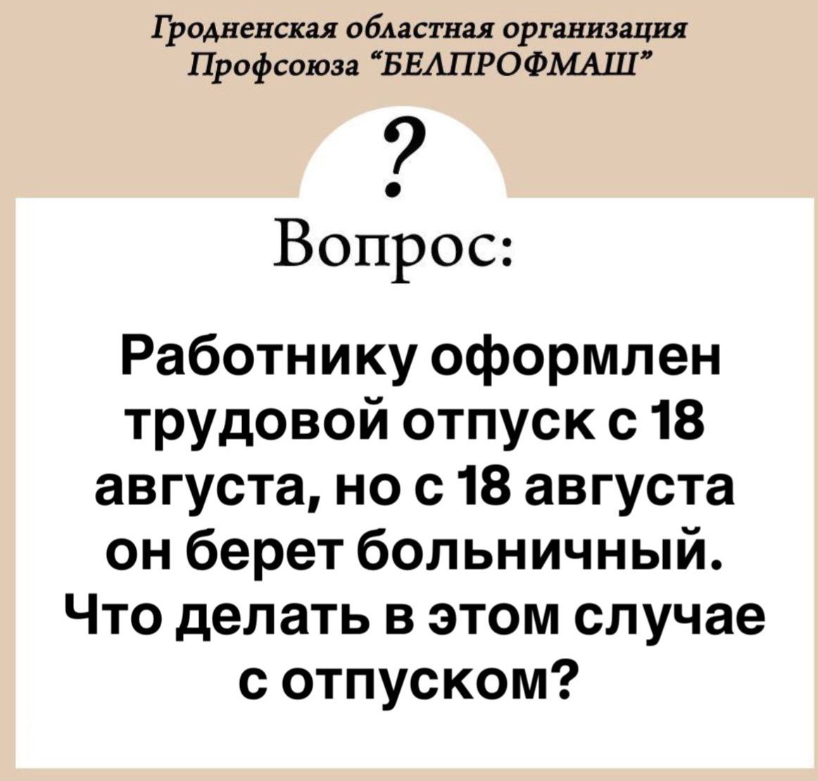 Вопрос: Работнику оформлен трудовой отпуск с 18 августа, но с 18 августа он берет больничный. Что делать в этом случае с отпуском? Ответ: Согласно ст. 171 ТК РБ при временной нетрудоспособности работника трудовой отпуск может быть перенесен или продлен. Если период временной нетрудоспособности работника наступает во время трудового отпуска, то он продлевается на соответствующее число […]